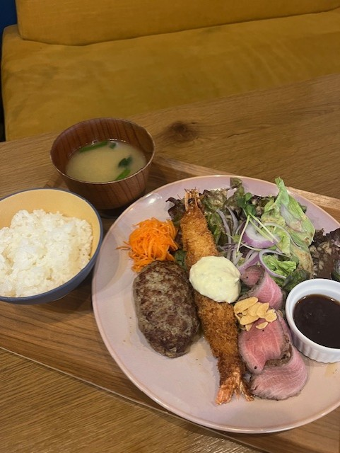 牛100%ハンバーグとエビフライとローストビーフと